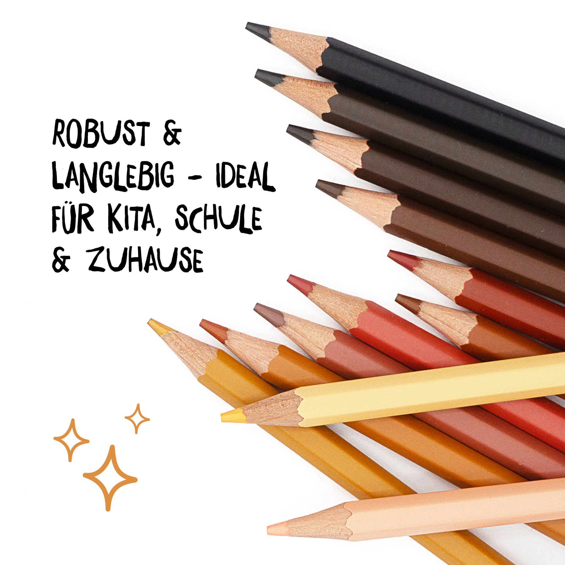 Ein weiterer Vorteil unserer Hautfarben-Buntstifte liegt in ihrer langlebigen Qualität. Sie sind so konzipiert, dass sie besonders widerstandsfähig gegen Bruch und Abnutzung sind, was sie ideal für den intensiven Gebrauch durch Kinder macht. Die nachhaltige Herstellung sorgt nicht nur für eine hohe Produktqualität, sondern auch dafür, dass die Buntstifte Hautfarben sicher und unbedenklich für Kinder sind. Im Gegensatz dazu können herkömmliche Buntstifte schädliche Chemikalien enthalten, die sowohl für Kinder als auch für die Umwelt problematisch sein können.